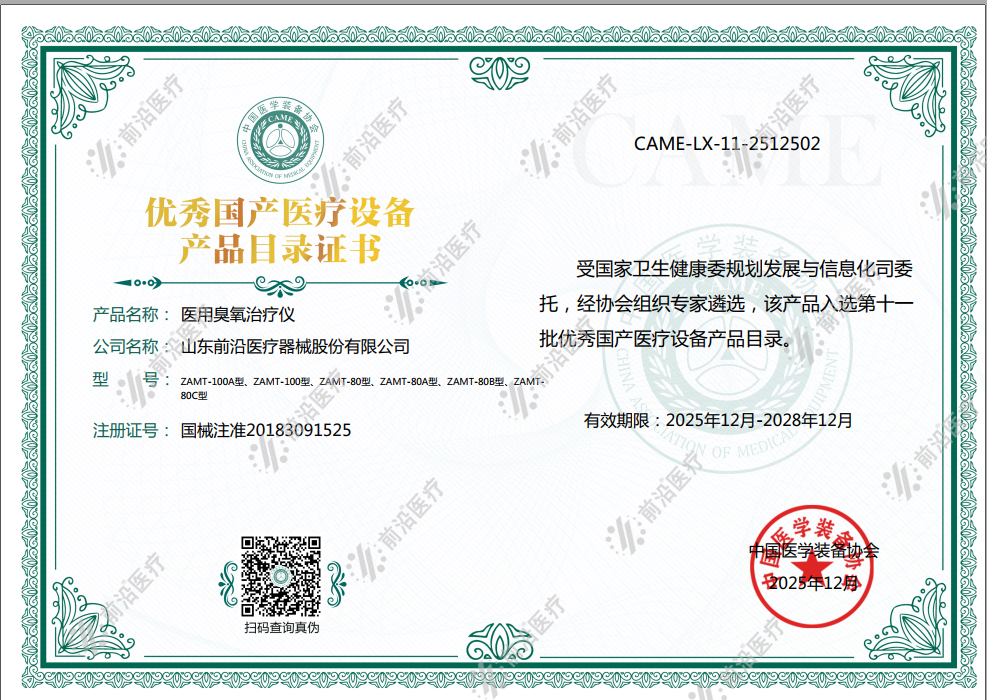 祝賀前沿醫(yī)療6款醫(yī)用臭氧治療儀,成功入選中國醫(yī)學(xué)裝備協(xié)會(huì)評(píng)選的第十一批優(yōu)秀國產(chǎn)醫(yī)療設(shè)備名單!這是繼2020年11月,公司研發(fā)生產(chǎn)的內(nèi)熱式針灸治療儀入選《第九批優(yōu)...
